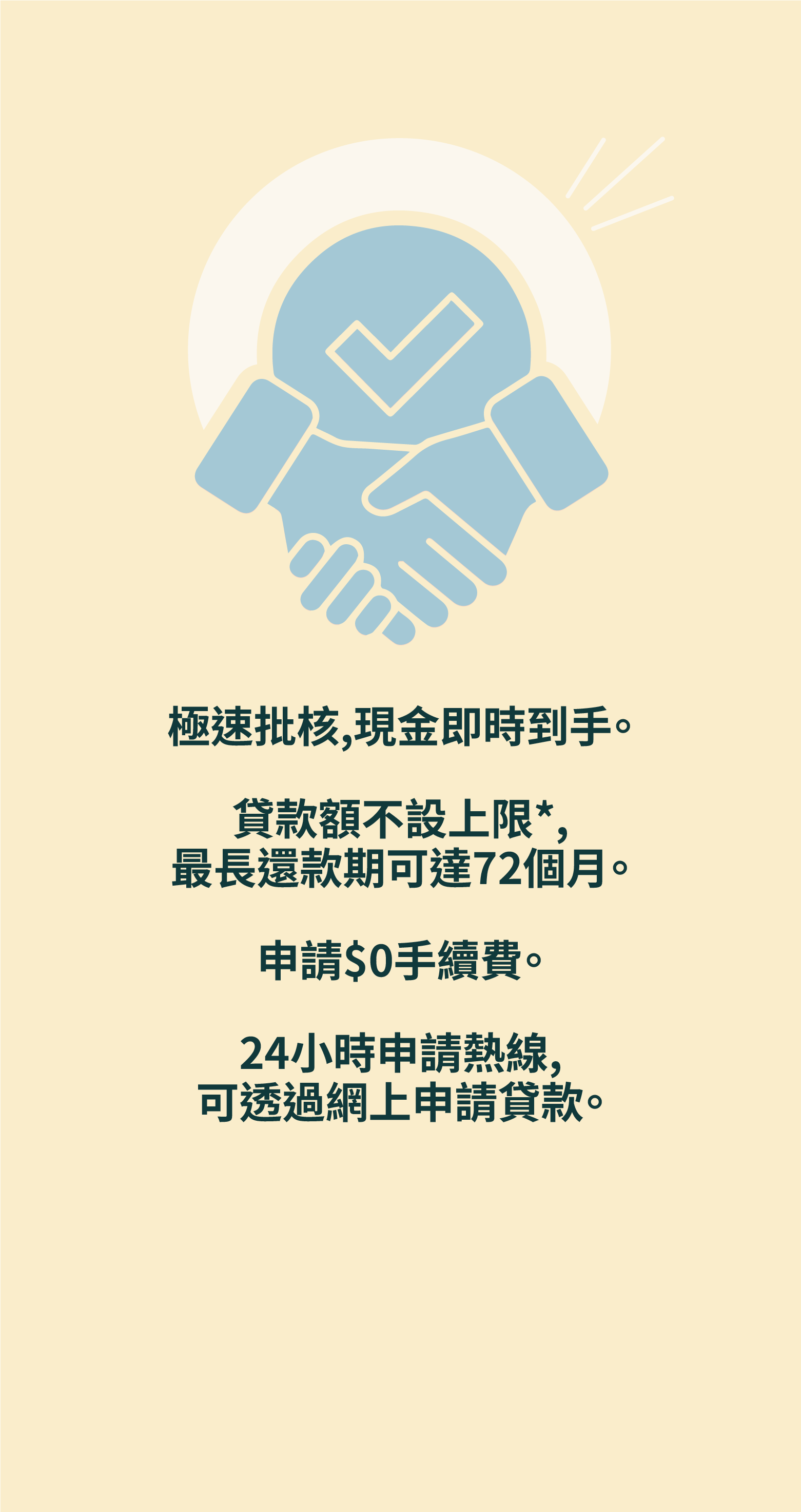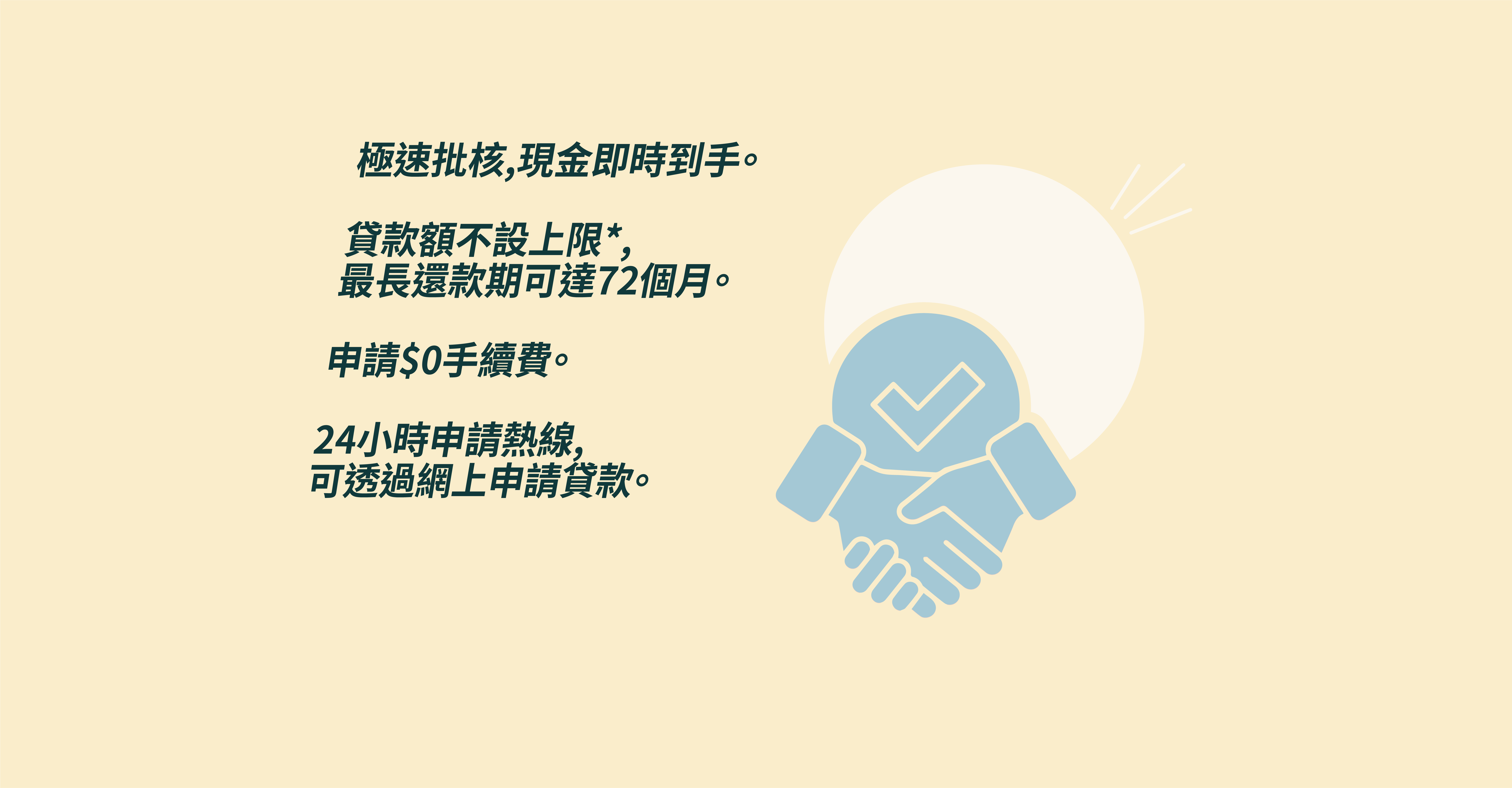 本人/吾等已年滿18歲,聲明本申請表內所載一切資料均屬真實、正確及完整並由本人/吾等親自填寫。本人/吾等已取得上述諮詢人同意,提供他們之資料以作此項貸款申請之用。本人/吾等亦聲明本人/吾等並無意圖於未來12個月內申請破產。